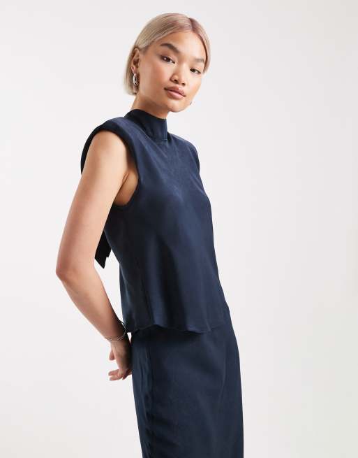 ASOS DESIGN - Top in raso blu navy allacciato al collo in coordinato