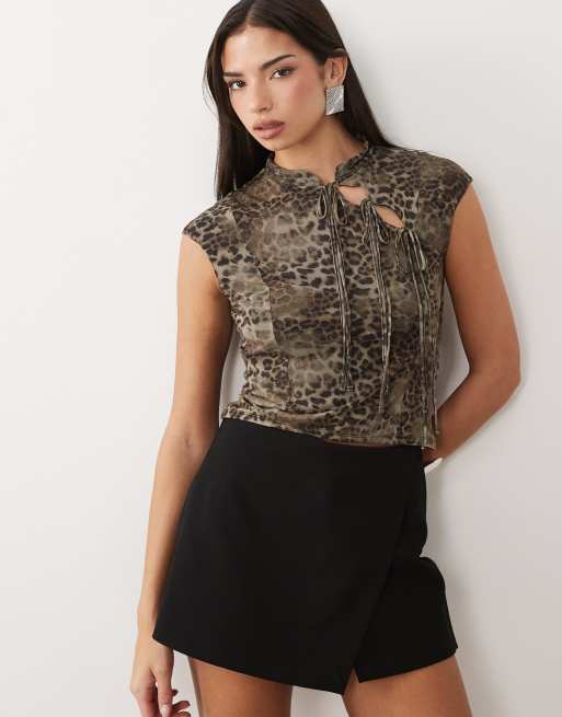 ASOS DESIGN - Top in rete animalier con maniche ad aletta e laccetti