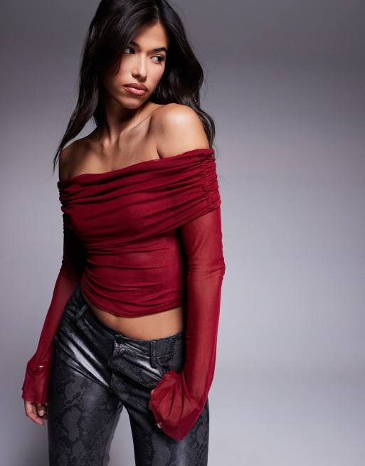 ASOS DESIGN - Top in rete bordeaux con maniche scampanate e spalle scoperte