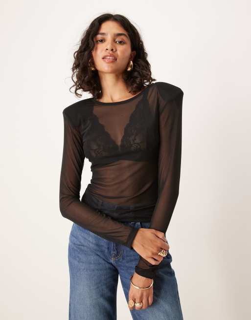 ASOS DESIGN - Top in tessuto a rete nero con spalle imbottite