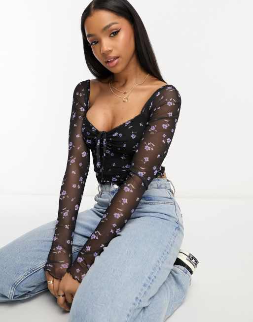 ASOS DESIGN - Top milkmaid a maniche lunghe in rete e fiori anni '90