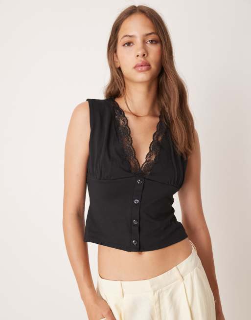 ASOS DESIGN - Top milkmaid nero con scollo profondo, bottoni e finiture in pizzo