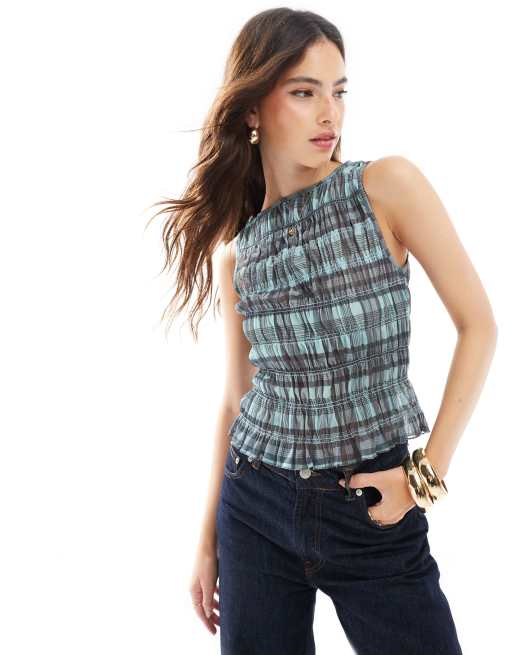 ASOS DESIGN - Top senza maniche in tessuto a rete blu a quadri
