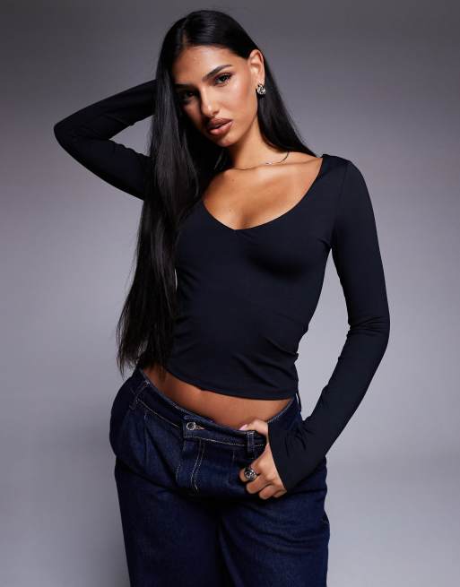 ASOS DESIGN - Top sinuoso nero in poliammide con scollo a V profondo