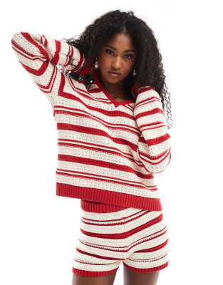 ASOS DESIGN - Top stile polo all'uncinetto a righe rosse in coordinato