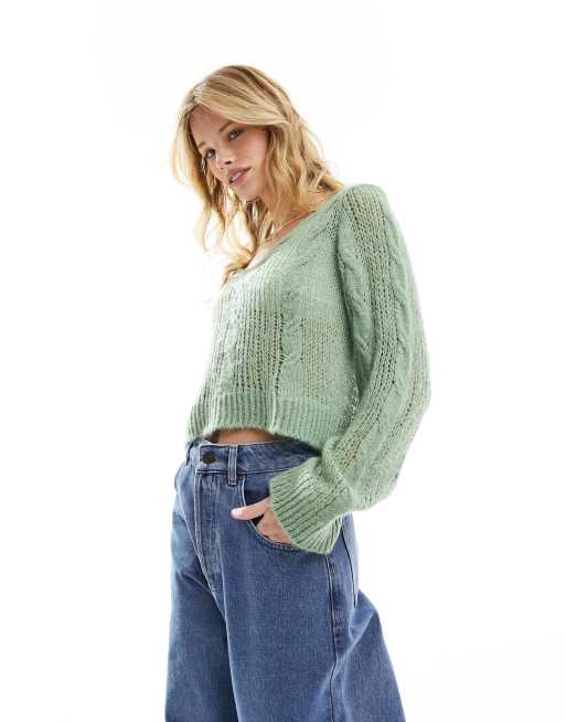 ASOS DESIGN - Top traforato lavorato a trecce con scollo a V verde salvia