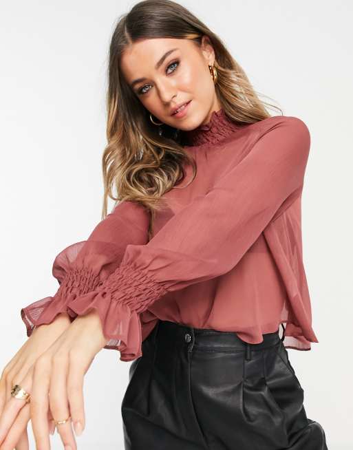 ASOS DESIGN - Top trasparente a maniche lunghe con collo arricciato rosa