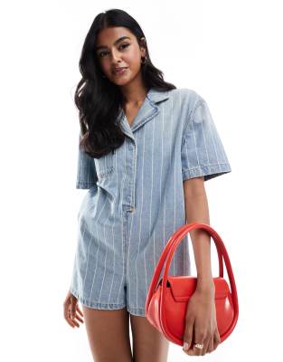 ASOS DESIGN - Tuta corta stile camicia squadrata in denim blu a righe