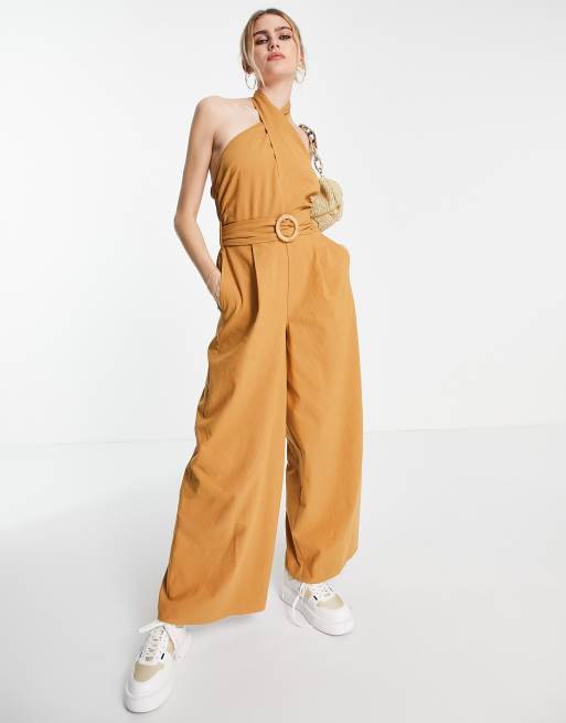 ASOS DESIGN - Tuta jumpsuit allacciata al collo con incrocio sul davanti e cintura intrecciata color sabbia