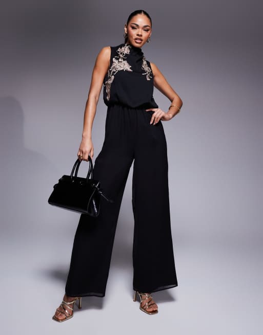 ASOS DESIGN - Tuta jumpsuit con fondo ampio e scollo ad anello nera con ricami