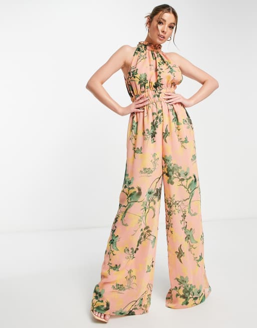 ASOS DESIGN - Tuta jumpsuit in chiffon a fiori raccolta in vita e allacciata al collo