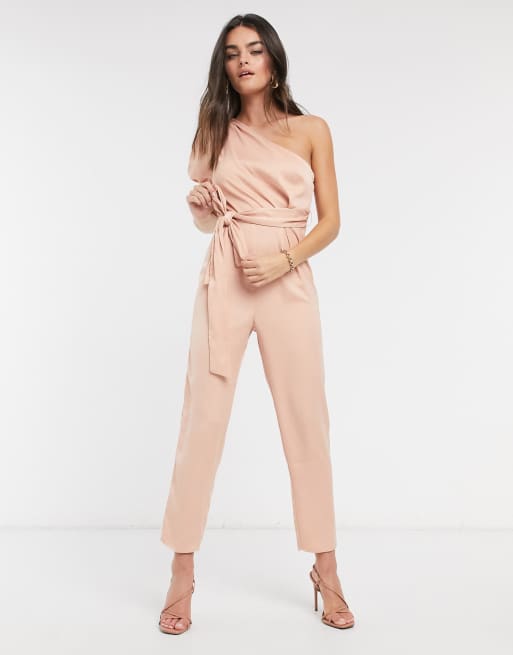 ASOS DESIGN - Tuta jumpsuit monospalla con manica a sbuffo cipria
