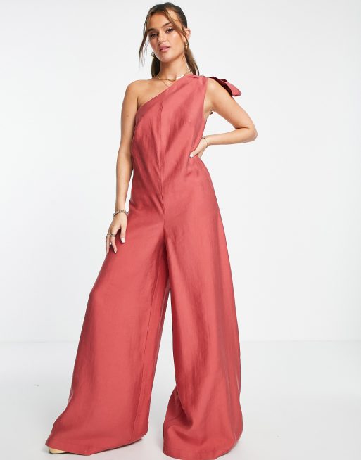 ASOS DESIGN - Tuta jumpsuit monospalla in lino rosso mattone con allacciatura