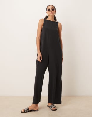 ASOS DESIGN - Tuta jumpsuit nera in cupro con scollo a barchetta
