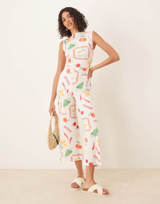 ASOS DESIGN - Tuta jumpsuit senza maniche con stampa stile cartolina, scollo a barchetta e schiena scoperta