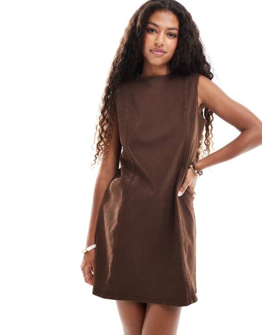 ASOS DESIGN - Vestito a trapezio in denim marrone cioccolato con cuciture a vista