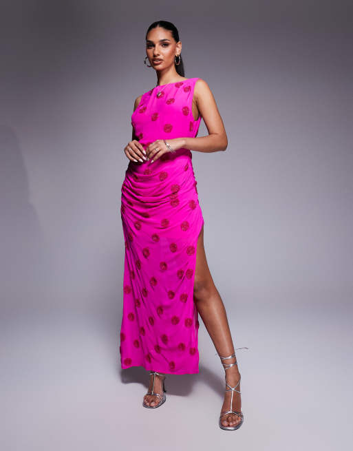 ASOS DESIGN - Vestito al polpaccio con drappeggio rosa a pois decorati