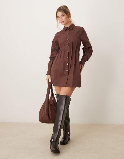 ASOS DESIGN - Vestito camicia corto a pieghe in twill marrone cioccolato