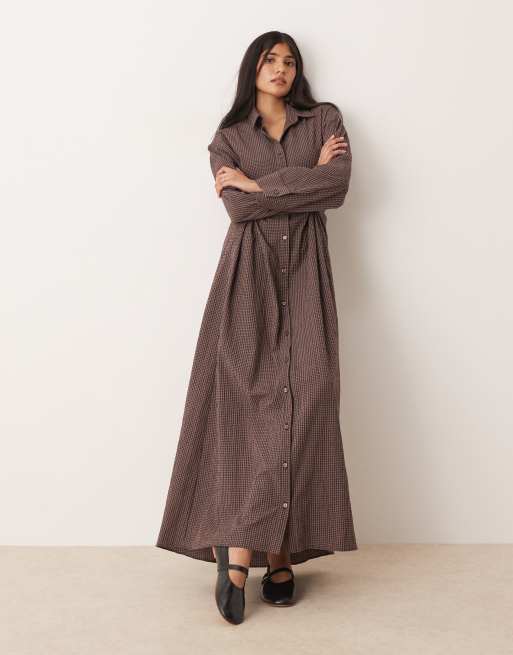 ASOS DESIGN - Vestito camicia lungo color cioccolato e blu navy a quadretti stretto in vita