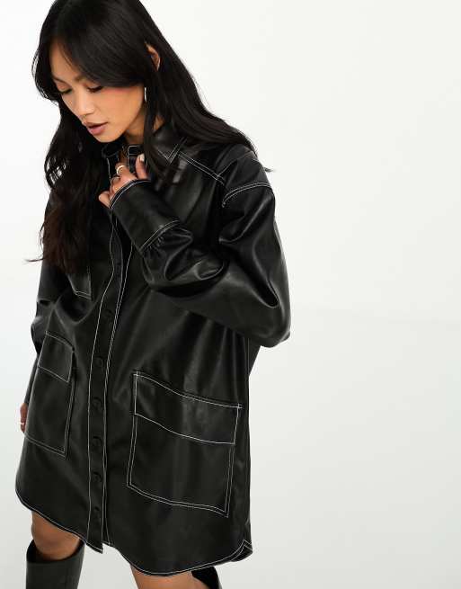 ASOS DESIGN - Vestito camicia oversize in similpelle PU nero con cuciture a contrasto