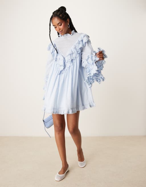 ASOS DESIGN - Vestito corto accollato blu tenue con volant