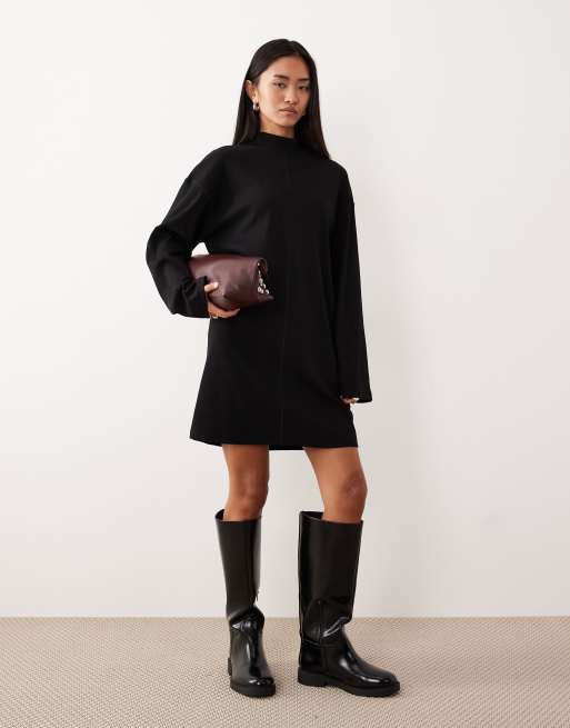 ASOS DESIGN - Vestito corto accollato nero a coste con cucitura centrale