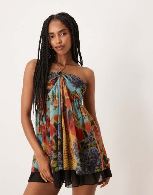 ASOS DESIGN - Vestito corto allacciato al collo con stampa patchwork e fondo a contrasto