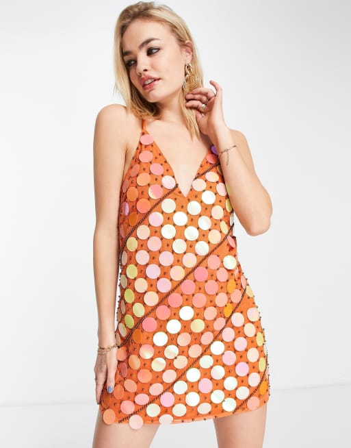 ASOS DESIGN - Vestito corto arancione con spalline sottili e paillettes a dischetto