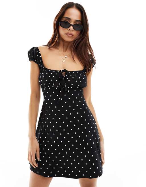 ASOS DESIGN - Vestito corto arricciato a pois con laccetti e maniche ad aletta