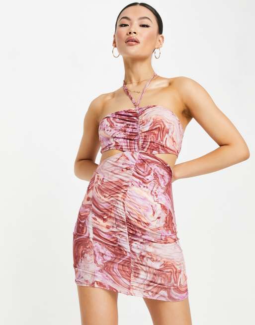 ASOS DESIGN - Vestito corto arricciato allacciato al collo con cut-out e stampa marmorizzata