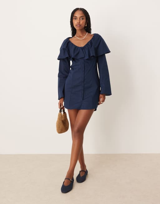 ASOS DESIGN - Vestito corto blu navy in popeline con bottoni e scollo con volant