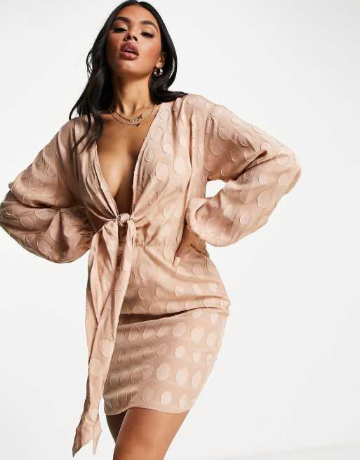 ASOS DESIGN - Vestito corto con scollo profondo con nodo in tessuto jacquard a pois