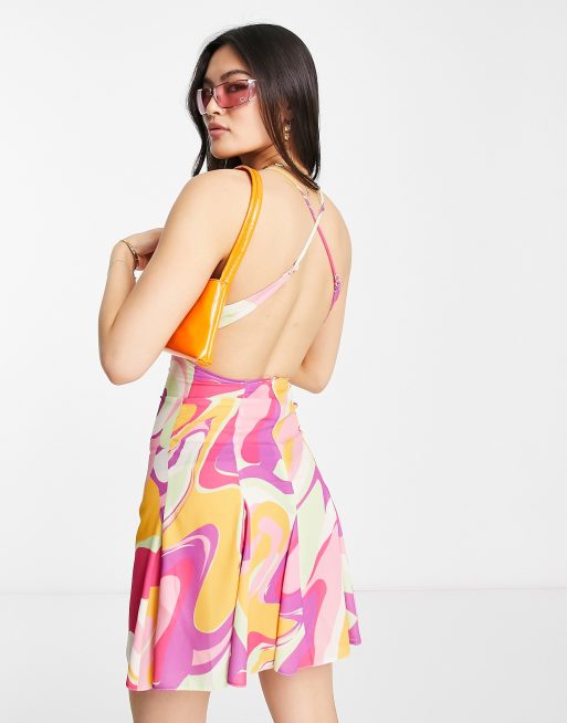ASOS DESIGN - Vestito corto con stampa vivace astratta, fascette sottili e gonna godet