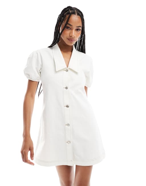 ASOS DESIGN - Vestito corto in denim con colletto e maniche a sbuffo ecru
