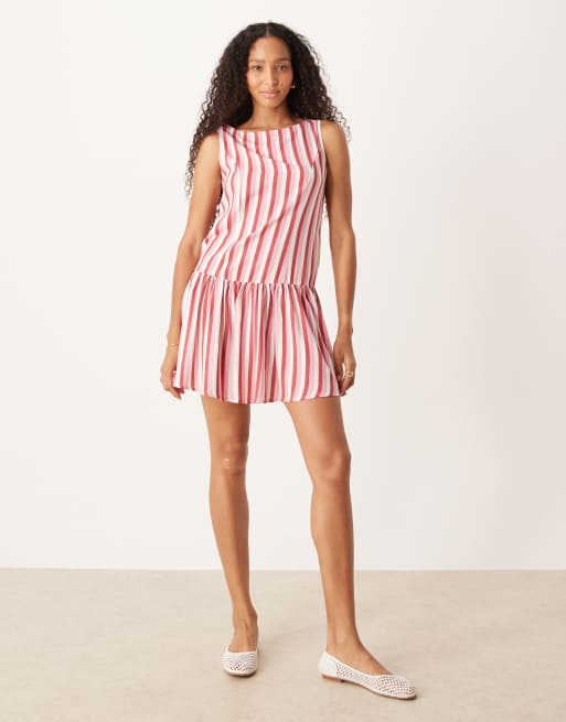 ASOS DESIGN - Vestito corto in misto lino rosa a righe con vita scesa