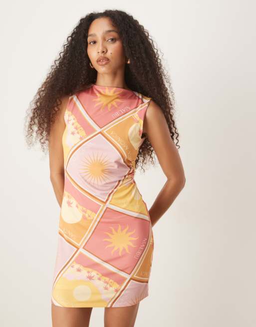 ASOS DESIGN - Vestito corto senza maniche rosa con stampa patchwork e schiena scoperta