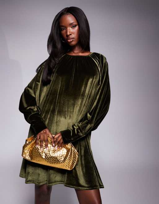ASOS DESIGN - Vestito corto verde in velluto con maniche voluminose