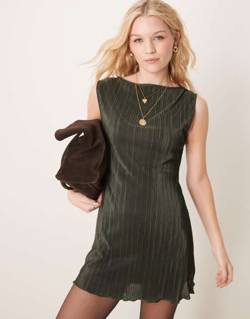 ASOS DESIGN - Vestito corto verde oliva plissé con scollo a barchetta