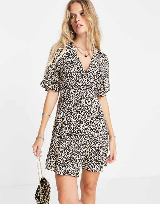 ASOS DESIGN - Vestito da giorno corto con stampa animalier con bottoni e maniche a pipistrello