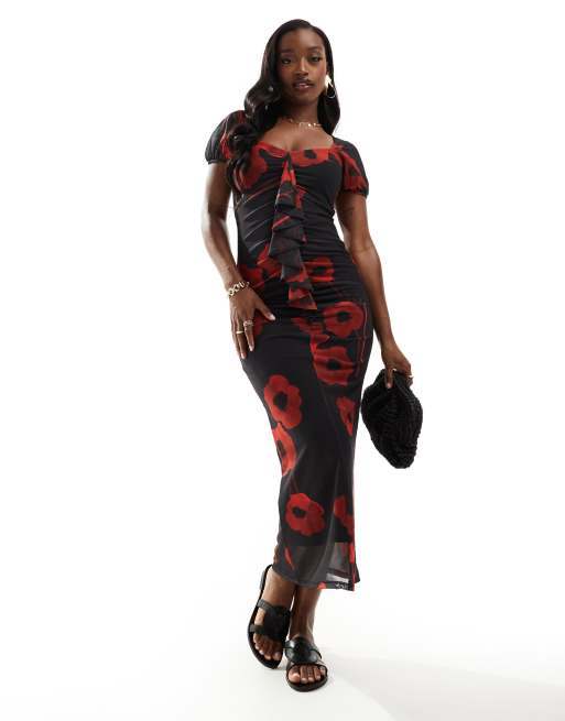 ASOS DESIGN - Vestito da giorno in rete con volant, maniche a sbuffo e scollo a cuore con stampa di papaveri
