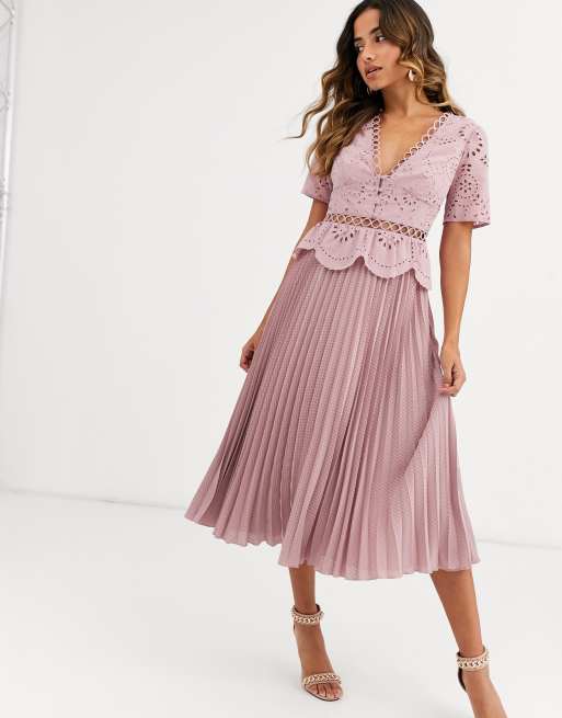 ASOS DESIGN - Vestito da giorno midi a pieghe in pizzo con bottoni sul davanti visone
