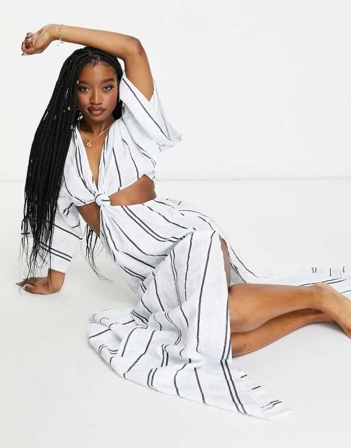 ASOS DESIGN - Vestito da mare lungo a kimono con maniche e nodo sul davanti a righe