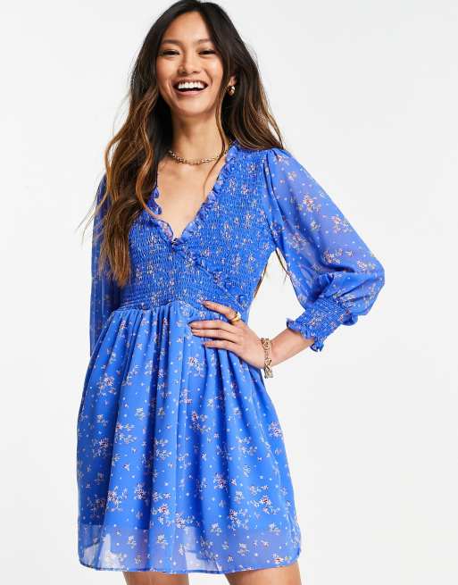 ASOS DESIGN - Vestito grembiule corto con polsini arricciati blu a fiori