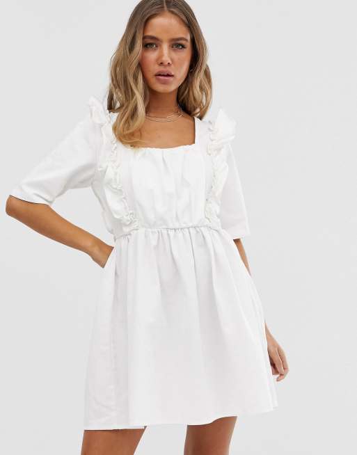 ASOS DESIGN - Vestito grembiule di jeans bianco con scollo quadrato e volant
