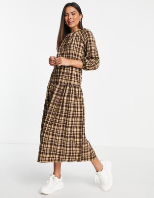 ASOS DESIGN - Vestito grembiule midi a balze in tessuto seersucker a quadri testurizzato