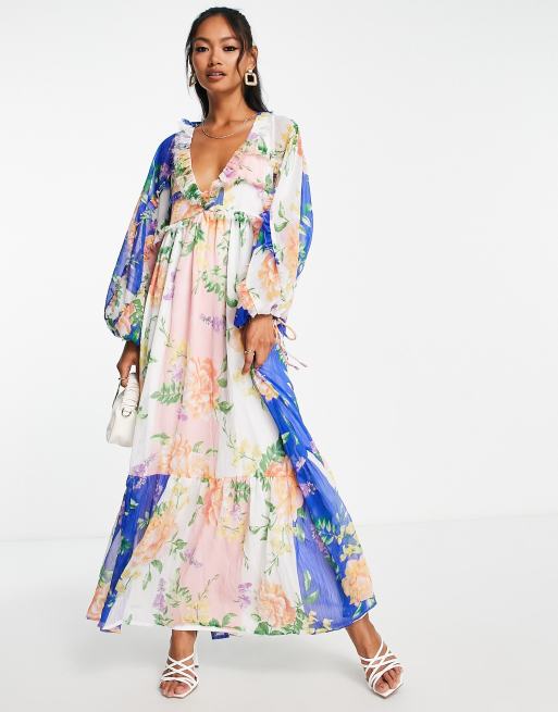 ASOS DESIGN - Vestito grembiule midi a maniche lunghe in chiffon con stampa a fiori oversize