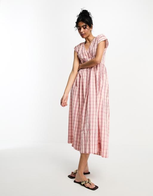 ASOS DESIGN - Vestito grembiule midi in cotone rosa quadri con scollo a V