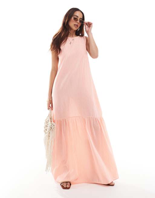 ASOS DESIGN - Vestito grembiule senza maniche a righe fluo con dorso a vogatore e gonna a balze