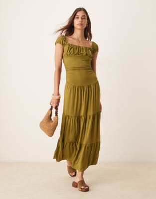 ASOS DESIGN - Vestito lungo a balze con bustino arricciato e scollo squadrato verde stile country