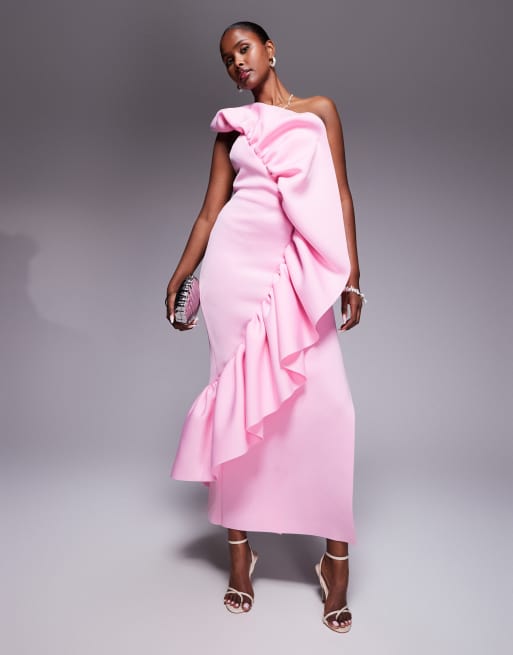 ASOS DESIGN - Vestito lungo a fascia strutturato in tessuto effetto scuba rosa con volant